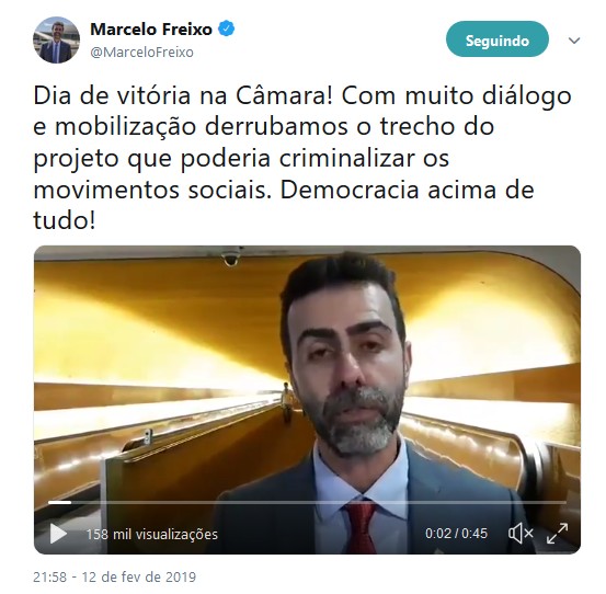 A “vitória” em questão teria sido a retirada de um ponto do projeto da lei de combate ao terrorismo (Projeto de Lei 10431/18), que poderia prejudicar movimentos sociais.