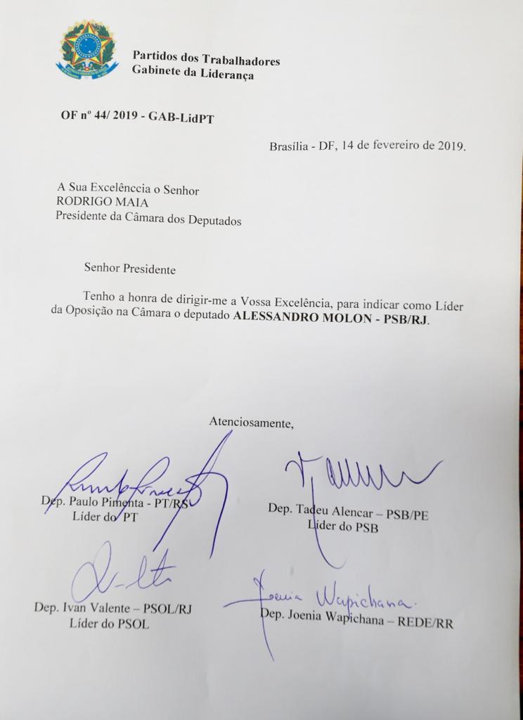 As lideranças do bloco (já dissolvido) formado por PT, PSOL, PSB e Rede encaminharam ao presidente da Câmara, Rodrigo Maia, um pedido formal para que indique Alessandro Molon (PSB) para a Liderança da Oposição. Maia deverá acatar o pedido.