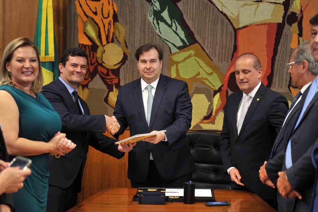 O ministro da Justiça e Segurança Pública, Sérgio Moro, entregou nesta terça-feira (19) ao presidente da Câmara, Rodrigo Maia, os três projetos de lei que compõem o chamado pacote anticrime, assinados horas antes pelo presidente Jair Bolsonaro.
