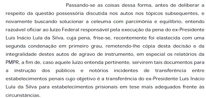 O desembargador menciona, no despacho, a possibilidade de transferência de Lula para outro presídio: