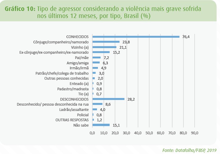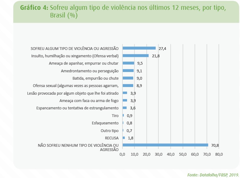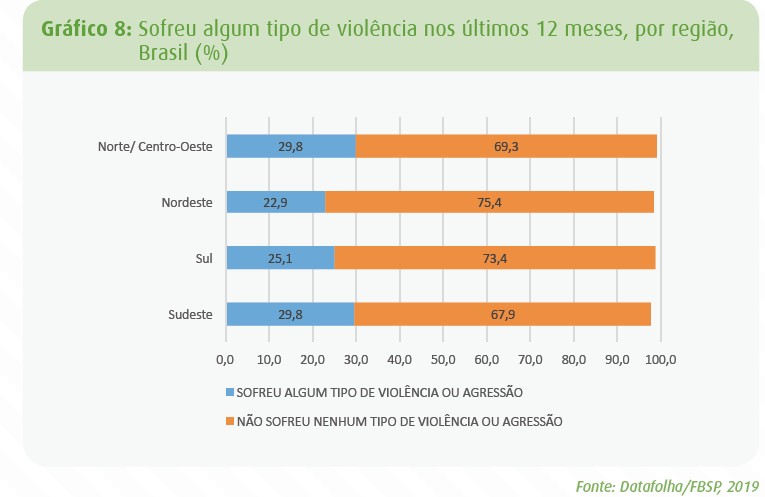 Trata-se de pesquisa quantitativa elaborada pelo FBSP e pelo Instituto Datafolha, com abordagem pessoal dos entrevistados em pontos de fluxo populacionais. As entrevistas foram realizadas mediante a aplicação de questionário estruturado, elaborado pelo FBSP, com cerca de 15 minutos de duração. A pesquisa teve um módulo específico de autopreenchimento, com questões sobre vitimização aplicadas somente às mulheres. As entrevistadas que aceitaram participar deste módulo responderam sozinhas as questões diretamente no tablete, após orientação do(a) pesquisador(a). O universo da pesquisa é a população adulta brasileira de todas as classes sociais com 16 anos ou mais. A abrangência é nacional, incluindo Regiões Metropolitanas e Cidades do Interior de diferentes portes, em todas as Regiões do Brasil. As entrevistas foram realizadas em 130 municípios de pequeno, médio e grande porte, no período de 04 a 05 de fevereiro de 2019. A amostra total nacional foi de 2.084 entrevistas. A amostra total de mulheres foi de 1.092 entrevistas, sendo que destas 897 aceitaram responder o módulo de autopreenchimento (78%). Ambas as amostras permitem a leitura dos resultados no total do Brasil, pelas regiões: Sudeste, Sul, Nordeste e Norte/ Centro-Oeste. A margem de erro para o total da amostra nacional é de 2,0 pontos para mais ou para menos. A margem de erro para o total da amostra de mulheres participantes do autopreenchimento é de 3,0 pontos para mais ou para menos.
