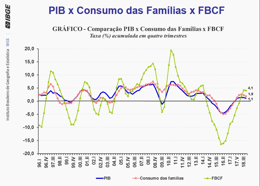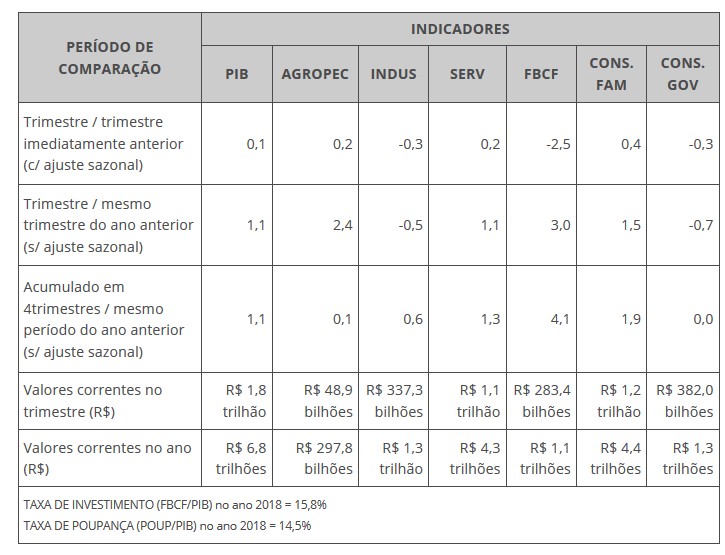 A alta de 0,1% no 4º trimestre de 2018 na comparação com o trimestre imediatamente anterior (com ajuste sazonal). É o oitavo resultado positivo consecutivo nesta base de comparação. A Agropecuária e os Serviços apresentaram variação positiva de 0,2%, enquanto a Indústria recuou 0,3%.