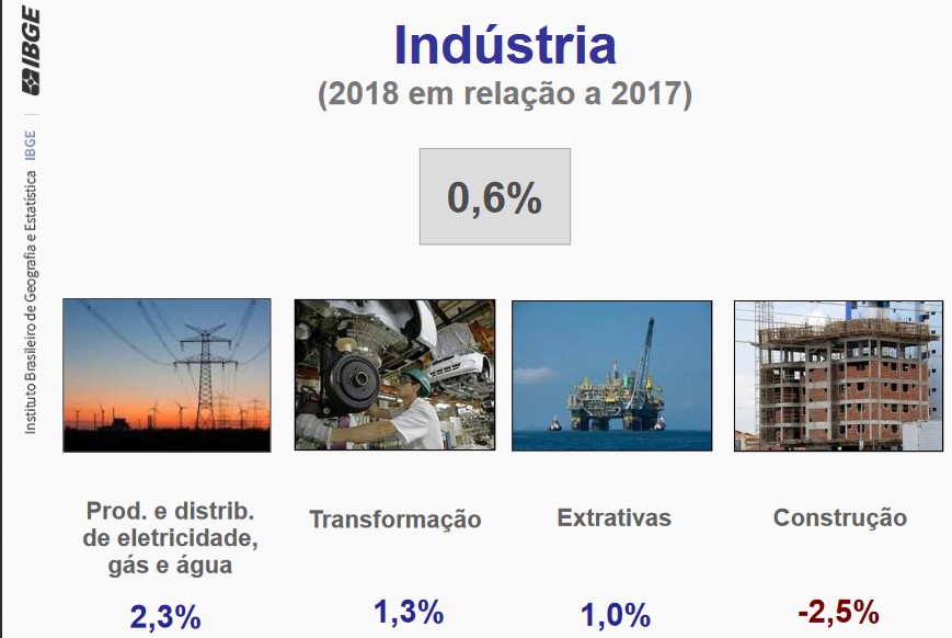 Na Indústria, o destaque positivo foi o desempenho da atividade Eletricidade e gás, água, esgoto, atividades de gestão de resíduos, que cresceu 2,3% em relação a 2017. Já o destaque negativo foi a Construção, que sofreu contração de -2,5%.
