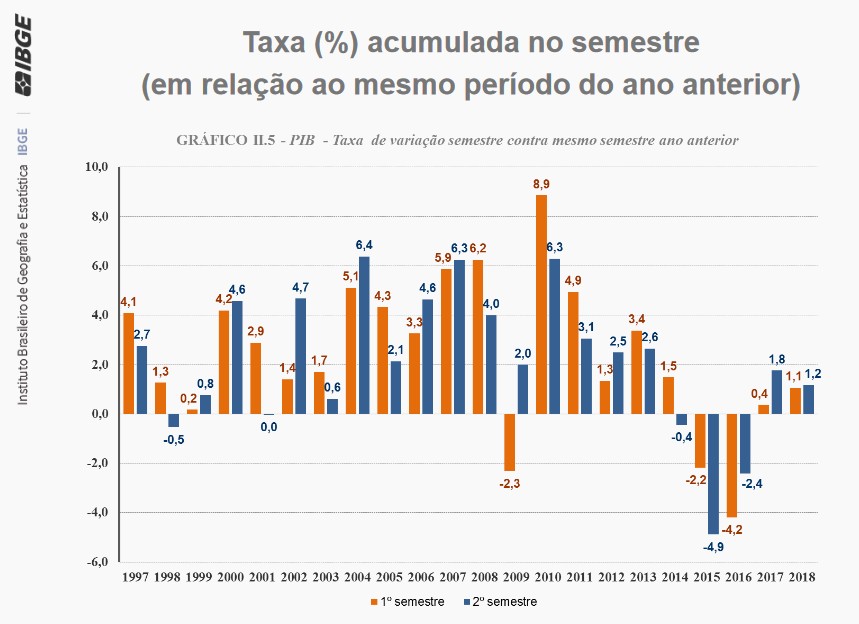 Em 2018, o PIB em 2018 teve crescimento de 1,1% em relação ao ano anterior. O crescimento do PIB resultou da expansão de 1,1% do Valor Adicionado a preços básicos e da alta de 1,4% no volume dos Impostos sobre Produtos líquidos de Subsídios. O resultado do Valor Adicionado neste tipo de comparação refletiu o desempenho das três atividades que o compõem: Agropecuária (0,1%), Indústria (0,6%) e Serviços (1,3%).