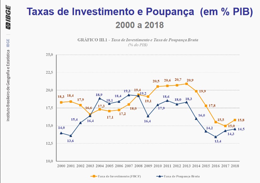 A taxa de investimento em 2018 foi de 15,8% do PIB, abaixo do observado em 2017 (15,0%). Já a taxa de poupança foi de 14,5% (ante 14,3% em 2017).