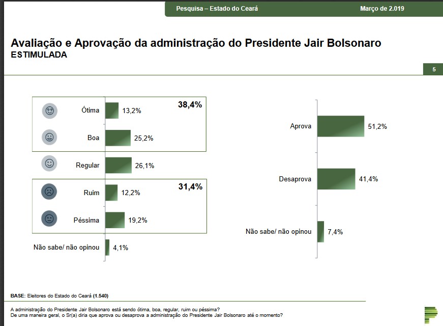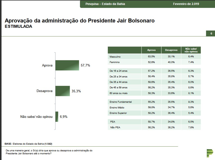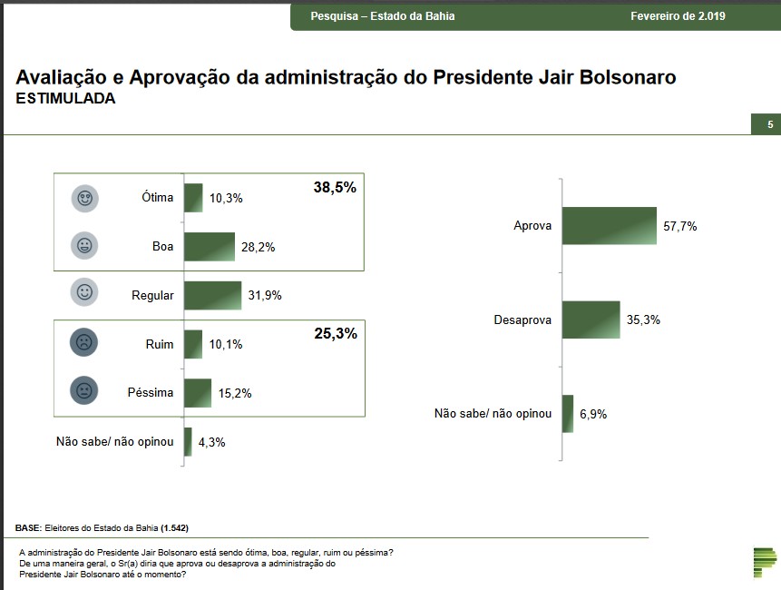 Pesquisa da aprovação de Bolsonaro na Bahia, nos dias 20 a 24 de fevereiro de 2019: clique aqui.