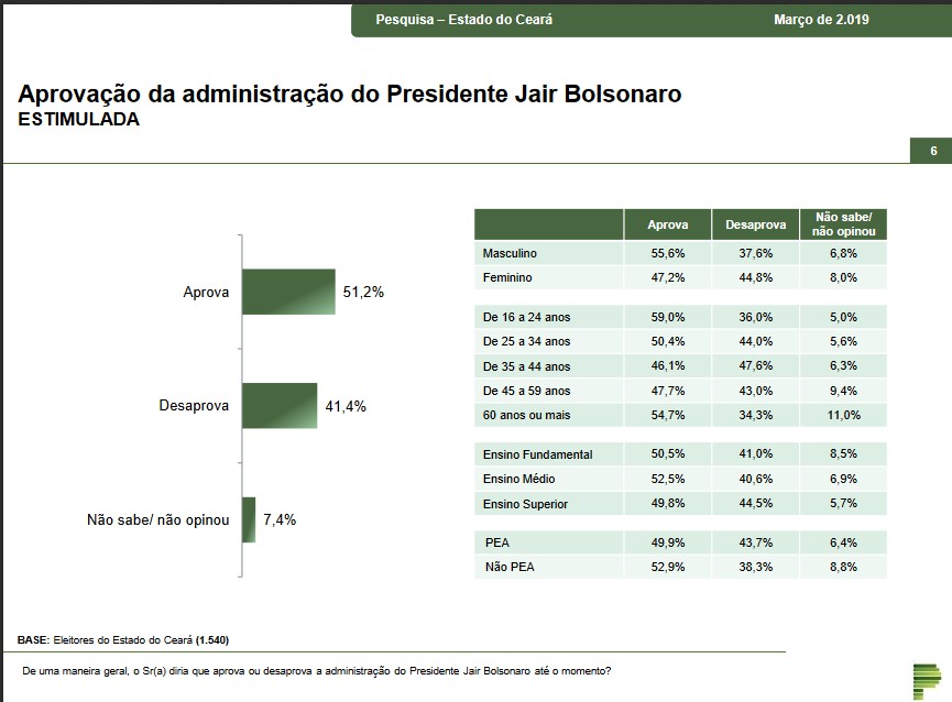 Pesquisa da aprovação de Bolsonaro na Bahia, nos dias 7 a 11 de março de 2019: clique aqui.