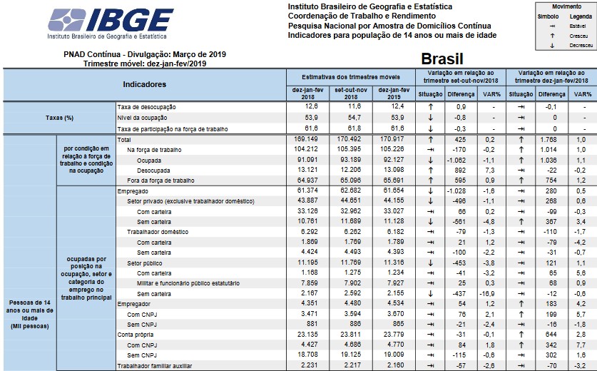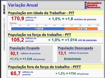 A comparaçao correta deve ser feita em relacao ao mesmo periodo do ano anterior, devido à sazonalidade do mercado de trabalho. Neste caso, houve SIM ligeira redução no percentual de desempregados. Deixem de ser fanáticos e parem de torcer contra o país. A proposta para a nova previdencia, bem como a proposta de reforma tributária que muito em breve será enviada ao congresso, terão enorme impacto na retomada gradual de contratações. Mas aos orfaos do presidiario nada disso importa, nao é mesmo, afinal o que importa mesmo é o poder e as mamatas que ele proporciona.