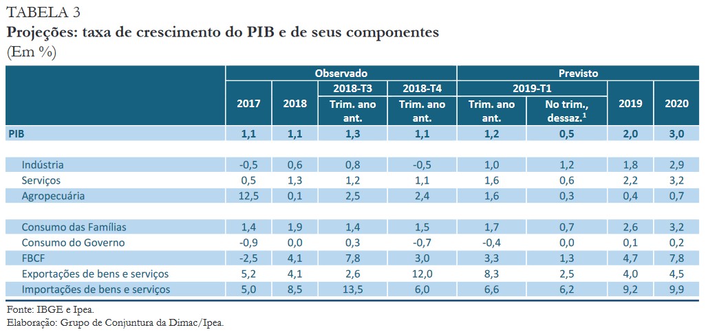 O Instituto de Pesquisa Econômica Aplicada (Ipea) reviu de 2,7% para 2% a previsão de crescimento do Produto Interno Bruto em 2019. Segundo estudo divulgado nesta quinta-feira, 28, pelo Grupo de Conjuntura do instituto, os primeiros indicadores do ano mostram que a recuperação da atividade econômica permanece lenta. As projeções para inflação foram reduzidas de 4,10% para 3,85%.