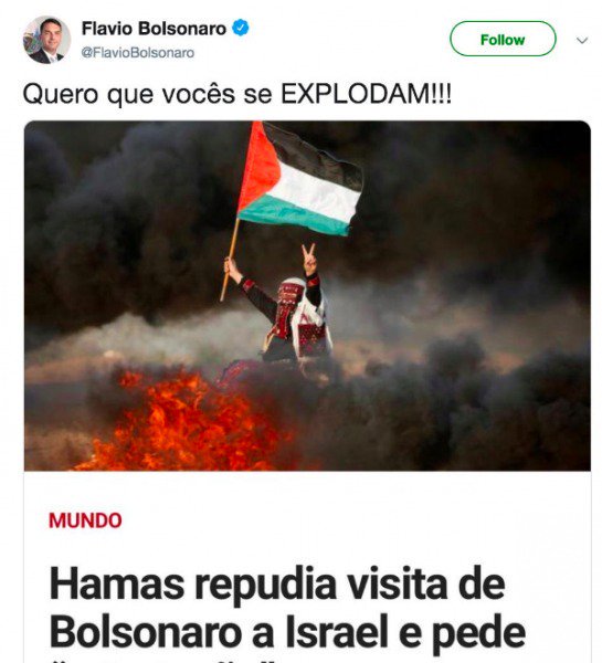 O senador Flavio Bolsonaro (PSL-RJ) xingou o Hamas nas redes sociais. Não me parece prudente ofender uma organização islâmica como essa. É uma retórica irresponsável que nos arrasta para dentro, gratuitamente, de um dos conflitos mais perigosos do mundo. O que ganhamos com isso?