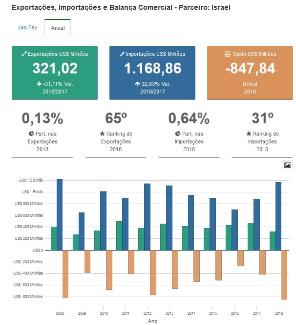 Em 2018, nossa balança com Israel foi negativa em US$ 847 milhões. No mesmo ano, exportamos para Israel apenas US$ 320 milhões.