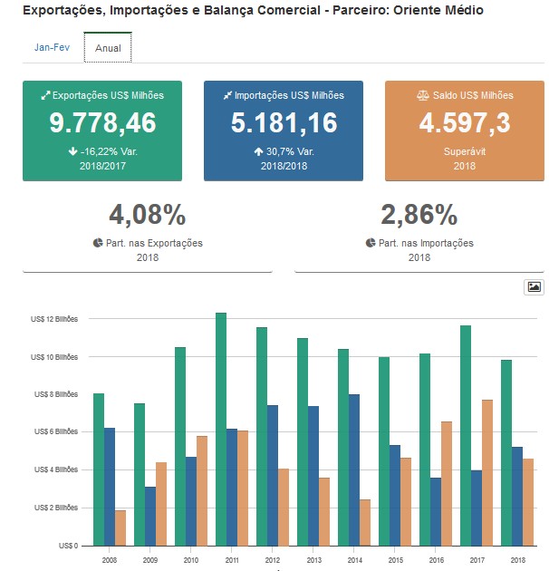 O saldo com o oriente médio, apenas em 2018, foi de US$ 4,6 bilhões.  No mesmo ano, nossas exportações para a região totalizaram quase 10 bilhões de dólares.