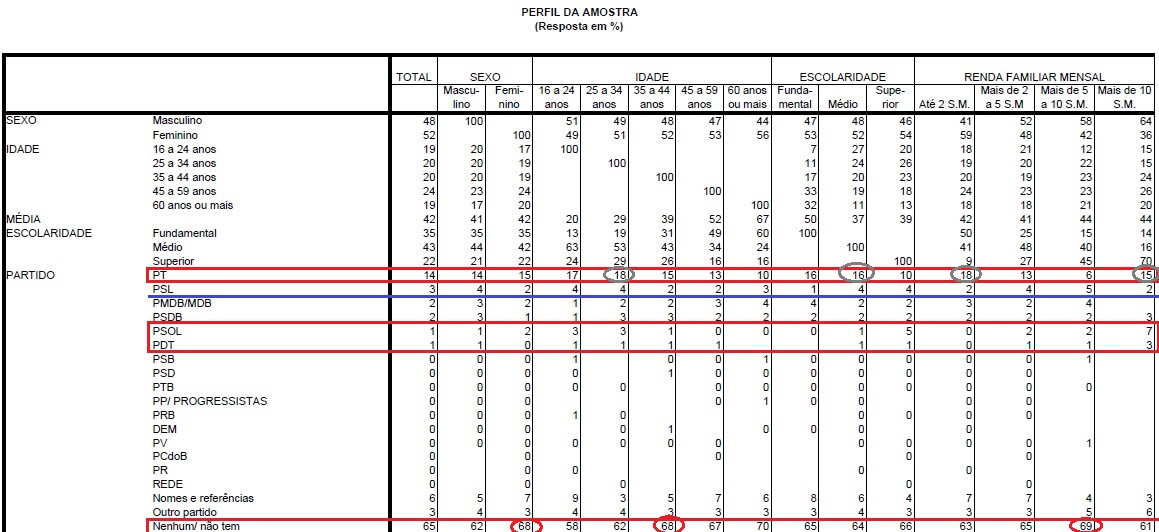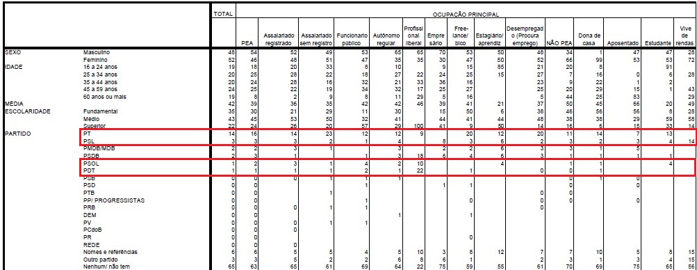 Outras legendas de esquerda tem alguma pontuação apenas entre eleitores mais instruídos e de maior renda, e as únicas que não ficam no zero a zero são PSOL e PDT. O PSOL chega a marcar 7 pontos entre eleitores com renda superior a 10 salários. O PDT pontua 3 pontos entre eleitores de renda mais alta.