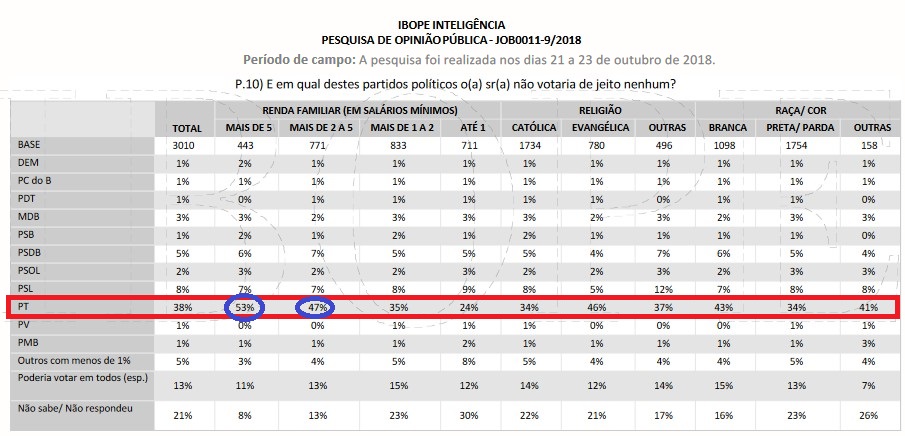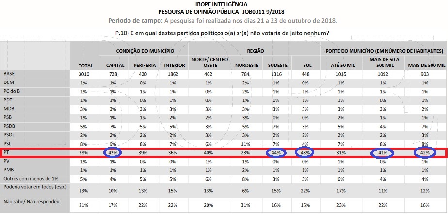 Como se vê, embora o PT seja o partido preferido, hoje, segundo o Dataafolha, por 14% dos brasileiros, ele também é o mais rejeitado, e por um percentual muito maior. Na época da pesquisa Ibope, 21 a 23 de outubro de 2018, o PT tinha 22% de preferência, e 38% de rejeição.