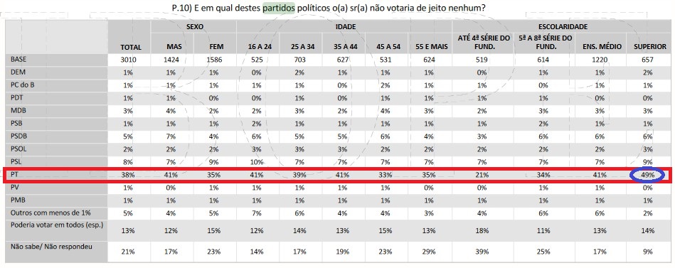 O maior problema do PT – e isso é grave, porque é o segmento mais atuante em redes sociais – está entre eleitores mais instruídos: entre os com ensino médio, 41% responderam que não votariam “de jeito nenhum” no partido, percentual que sobe para 49% entre eleitores com ensino superior.