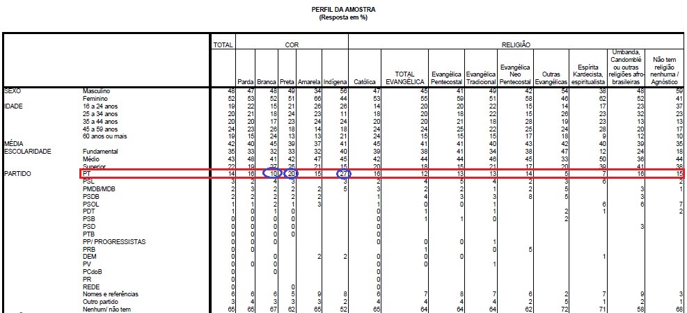 Outro destaque para o PT é a preferência entre o eleitorado que se declara preto e índio: entre os primeiros, o partido tem 20% da preferência, e 27% entre os segundos.