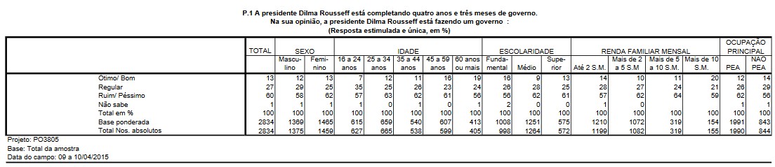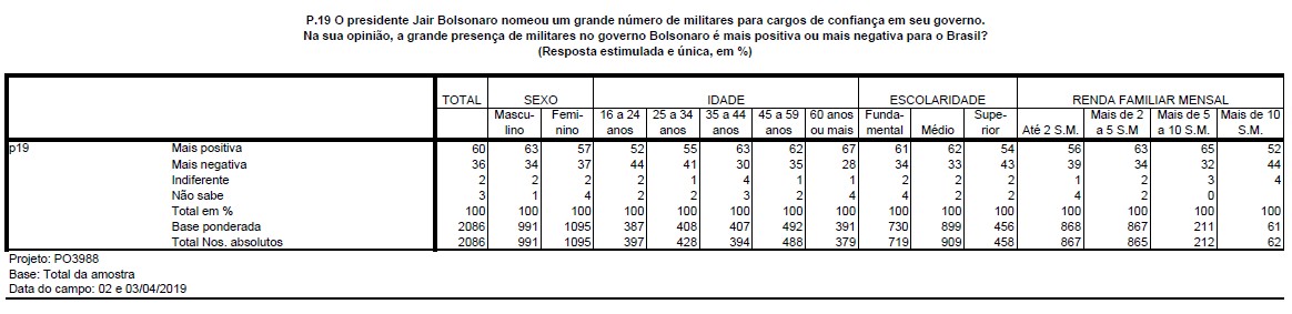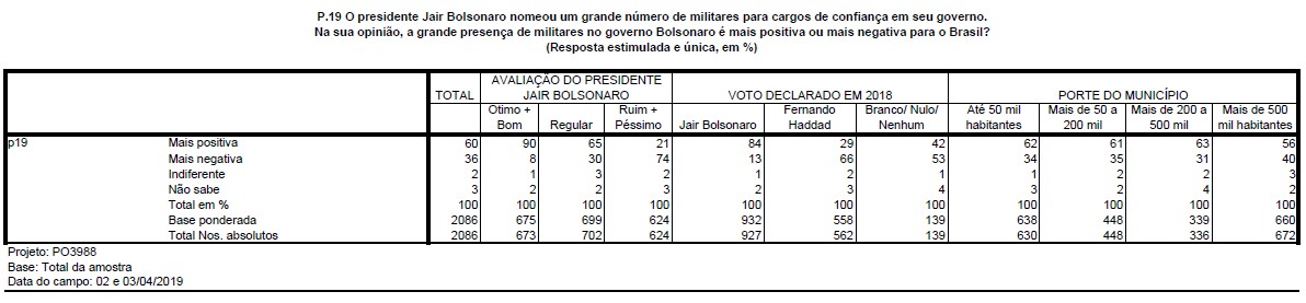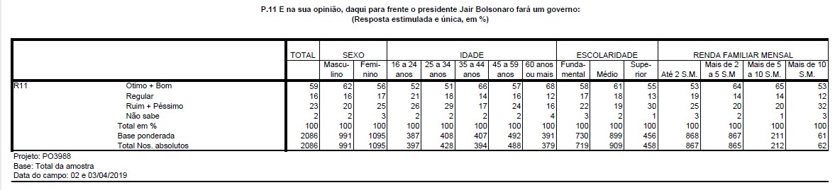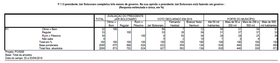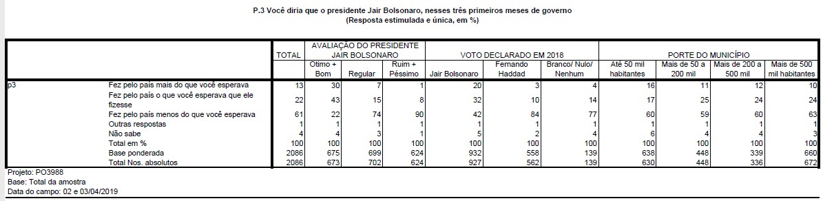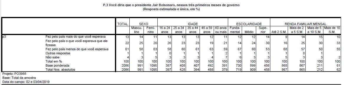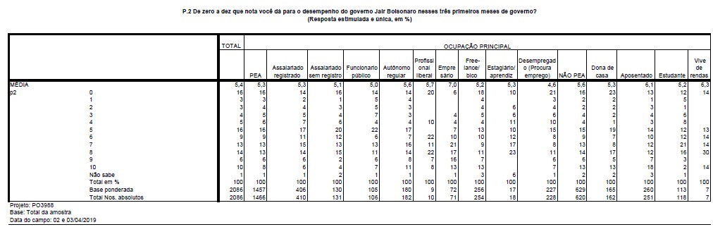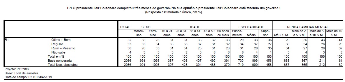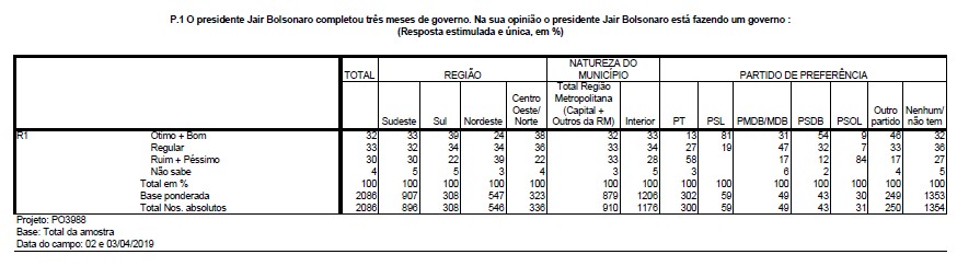 A tabela acima mostra que a rejeição a Bolsonaro é muito maior no nordeste (39%) do que a média nacional (30%). A região Sul é a que mais apoia o presidente, prestigiando-lhe com 39% de ótimo/bom e 22% de ruim/péssimo.