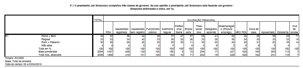 Na estratificação por ocupação profissional, observa-se que Bolsonaro tem aprovação alta nos seguintes segmentos: autônomo regular (37%), profissional liberal (47%), empresário (57%) e aposentado (36%). Seu pior desempenho está entre os desempregados, onde ele tem rejeição de 40%.