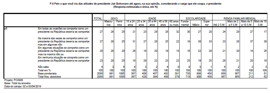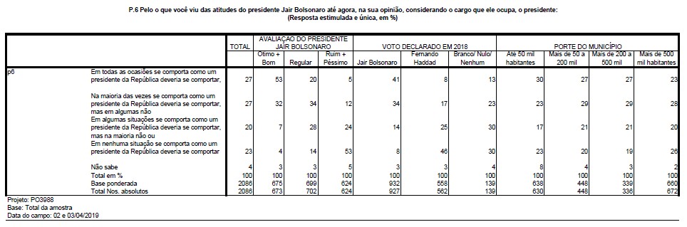 Entre seus próprios eleitores, 41% acham que Bolsonaro se comporta exemplarmente, ao passo que 34% acham que ele é exemplar na maioria das vezes, mas em algumas não. Entre eleitores de Haddad, 46% responderam que Bolsonaro não se comporta como um presidente deveria em nenhuma situação. Curiosamente, contudo, 25% dos eleitores de Haddad tem visão tolerante sobre o comportamento de Bolsonaro: 8% acham que ele se comporta bem, e 17% que ele se comporta bem na maioria das vezes.