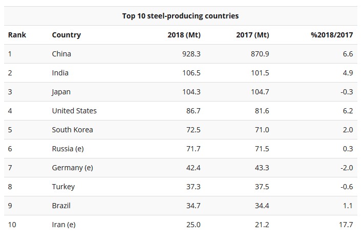 Abaixo, o press release com informações sobre a produção mundial de aço em 2018.