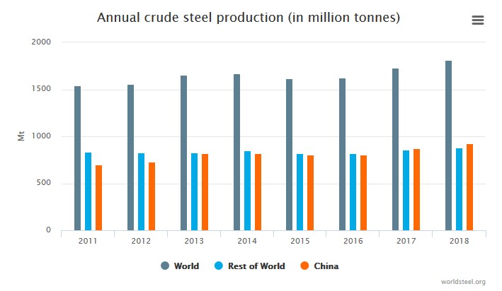 MtAnnual crude steel production (in million tonnes)WorldRest of WorldChina