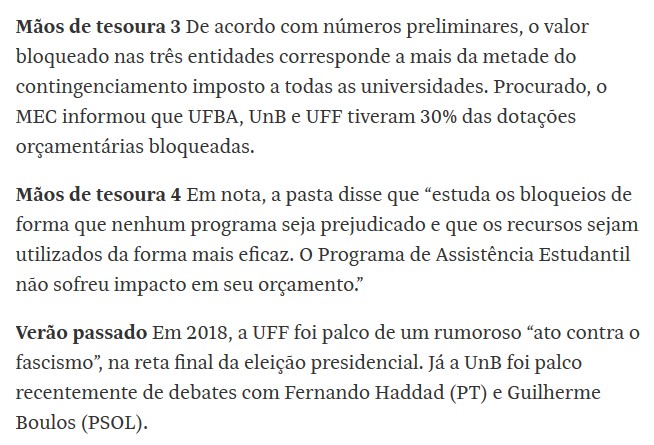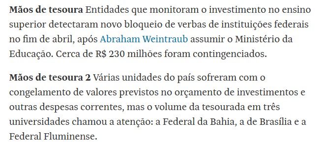 Hoje, no Painel da Folha, notícias preocupantes de contingenciamento de recursos para Universidades Federais. Há preocupação de que o governo, tendo identificado que elas abrigam importantes núcleos de resistência a seu governo, tome medidas antidemocráticas, como a tentativa de asfixiá-las financeiramente.