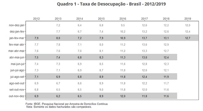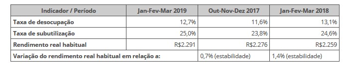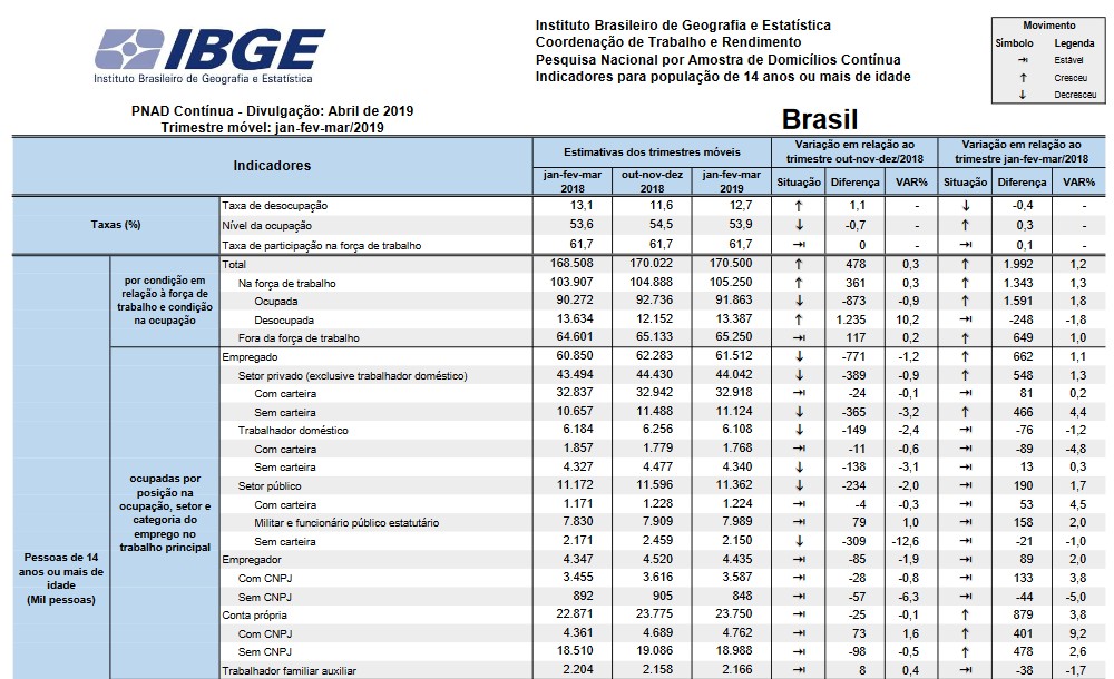 A taxa de desocupação foi de 12,7% no trimestre móvel encerrado em março de 2019 e subiu 1,1 p.p. em relação ao trimestre móvel de outubro a dezembro de 2018 (11,6%). Em relação ao trimestre móvel de janeiro a março de 2018 (13,1%), houve queda de -0,4 p.p..