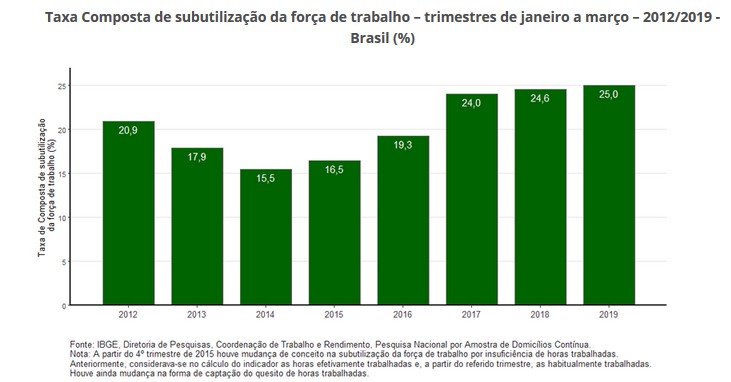 No trimestre de janeiro a março de 2019, o número de pessoas subutilizadas no Brasil chegou a 28,3 milhões. Este contingente subiu 5,6% (mais 1,5 milhão de pessoas) frente ao trimestre de outubro a dezembro de 2018, quando a subutilização foi estimada em 26,8 milhões de pessoas. No confronto com igual trimestre de 2018, quando havia 27,5 milhões de pessoas subutilizadas, houve alta de 3,0%, (mais 819 mil pessoas).