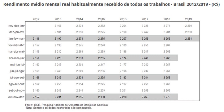 O rendimento médio real habitual (R$ 2.179) ficou estável em ambas as comparações. A massa de rendimento real habitual (R$ 205,3 bilhões) ficou estável contra o trimestre anterior e cresceu 3,3% em relação ao mesmo trimestre de 2018.