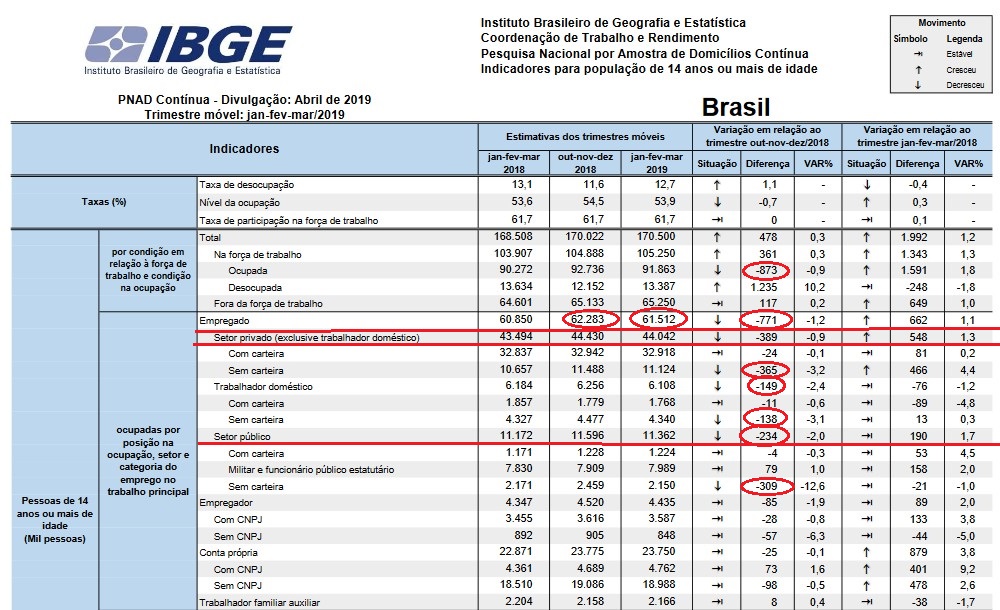 A população ocupada (91,9 milhões) caiu -0,9% (menos 873 mil de pessoas) em relação ao trimestre de outubro a dezembro de 2018 e cresceu 1,8% (mais 1,6 milhão de pessoas) em relação ao mesmo trimestre de 2018.