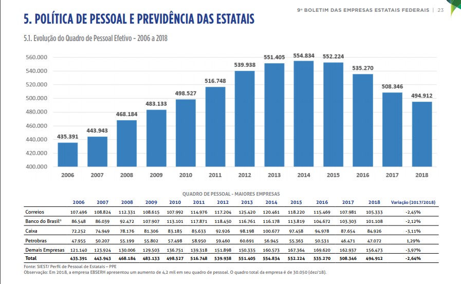O boletim também traz dados referentes à redução de pessoal. Em 2018, na comparação com 2017, houve uma redução de 13.434 pessoas no quadro das estatais. As principais reduções ocorreram na Caixa Econômica Federal (2.728 empregados), Correios (2.648) e Banco do Brasil (2.195 empregados).