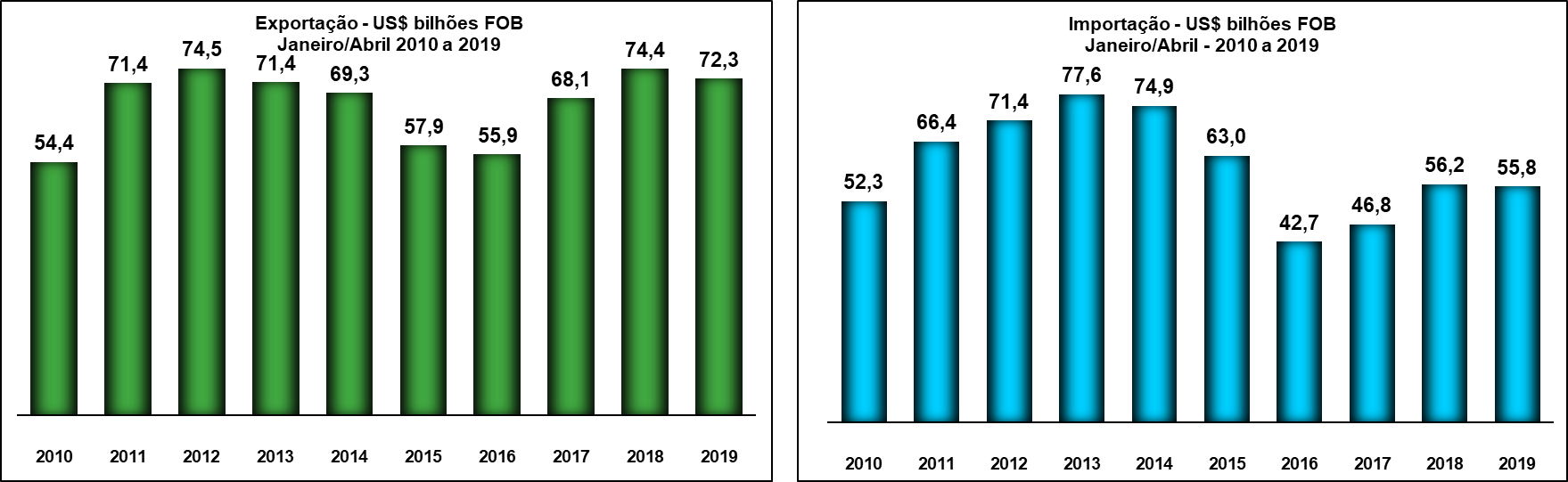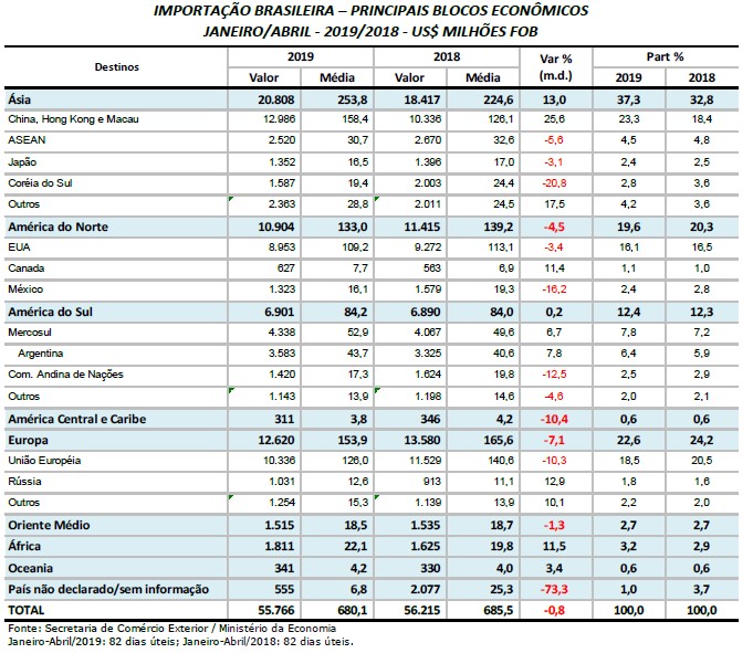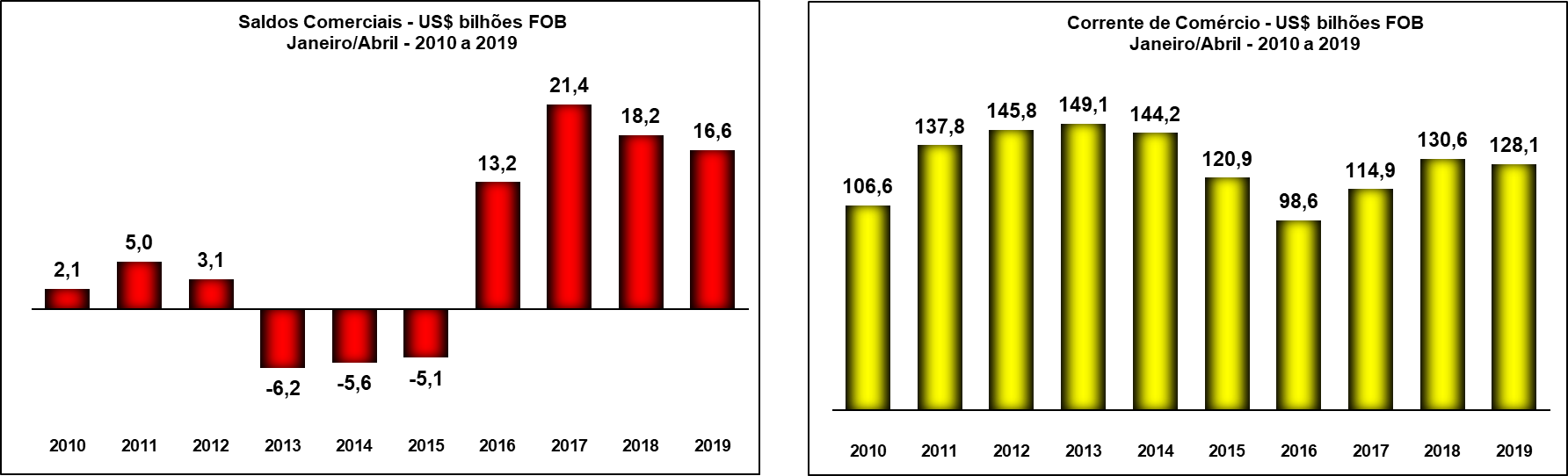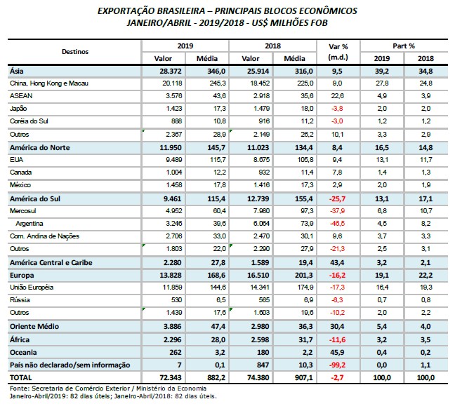Esse foi o segundo melhor resultado da série histórica para o mês, só perdendo para abril de 2017 (US$ 6,963 bilhões). Com o resultado de abril, a balança comercial – diferença entre exportações e importações – acumula superávit de US$ 16,576 bilhões nos quatro primeiros meses de 2019, valor 8,7% inferior ao do mesmo período do ano passado.