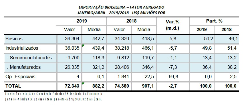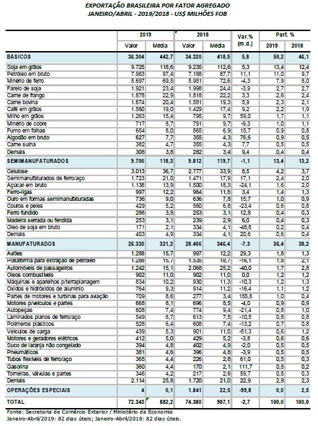 No mês passado, as exportações somaram US$ 19,689 bilhões, com leve queda de 0,1% em relação a abril de 2018 pelo critério da média diária. As vendas de manufaturados cresceram apenas 0,8% na mesma comparação, com destaque para tubos flexíveis de ferro ou aço (R$ 0 para R$ 148 milhões), máquinas e aparelhos agrícolas (208,3%), partes de motores e turbinas para aviação (116,9%) e torneiras, válvulas e partes (99,7%).