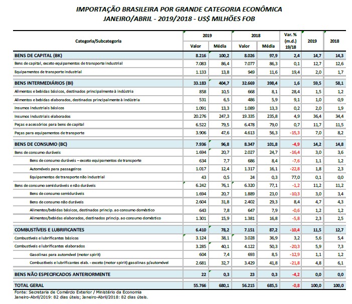 As importações de bens de consumo caíram 6,6%. As compras de bens intermediários recuaram 0,2%. Apenas a importação de combustíveis e lubrificantes aumentaram 10,4% na mesma comparação, decorrente principalmente da valorização do petróleo no mercado internacional.