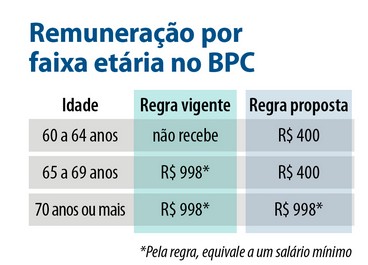 Pela proposta do governo, idosos com renda familiar mensal de até R$ 238 terão de aguardar até os 70 anos para receber integralmente o Benefício de Prestação Continuada (BPC). Atualmente o benefício, no valor de um salário mínimo (R$ 998), é pago mensalmente às pessoas com deficiência e aos idosos com 65 anos ou mais que comprovem não possuir meios de se sustentar, e nem de ter auxílio da família. A equipe econômica quer criar duas faixas de benefícios para idosos carentes — a partir dos 60 anos, com valor de R$ 400, e a partir dos 70 anos, no valor de um salário mínimo.