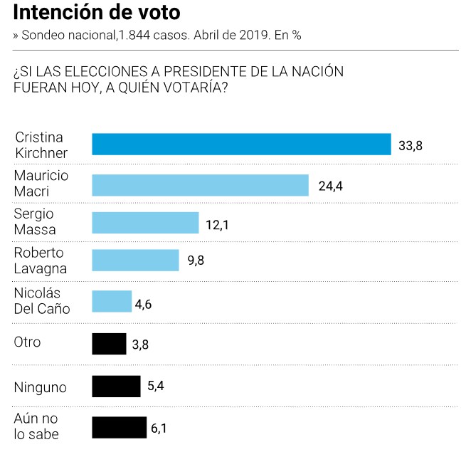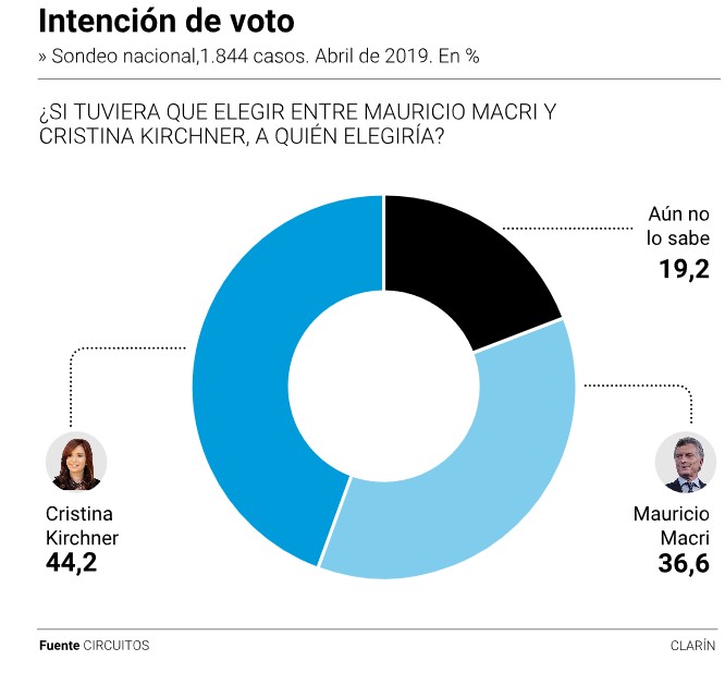 Em pesquisa de intenção de voto do instituto Circuitos, divulgada pelo Clarín (cujos proprietários são inimigos políticos de Kirchner), Cristina aparece com 44,2%, contra 36,6% de Macri, numa disputa apenas entre os dois.