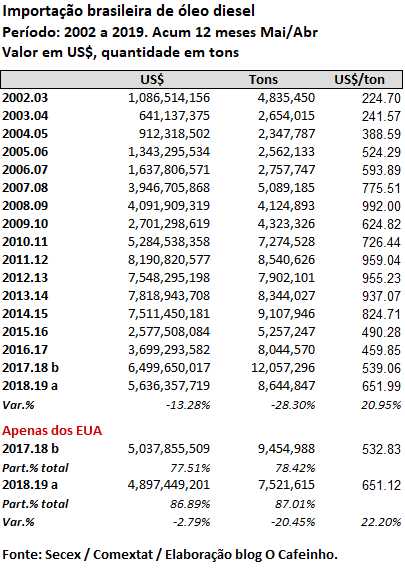 A importação de diesel totalizou US$ 1,7 bilhão nesses quatro primeiros meses do ano. Apesar da queda de 27% sobre o ano anterior, este valor representa alta de 14% sobre 2017 e de 143% sobre 2016.