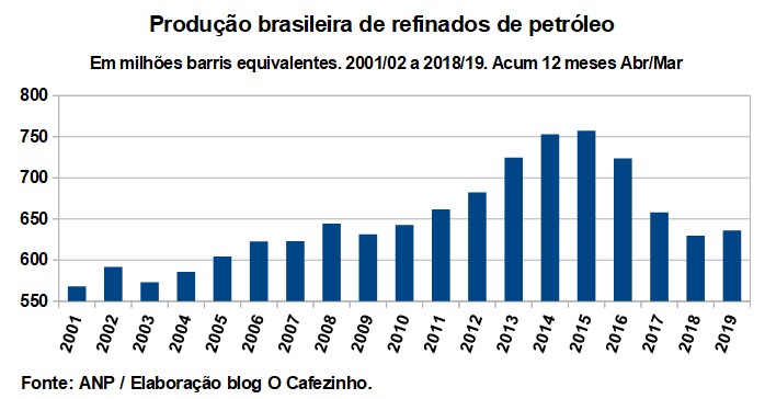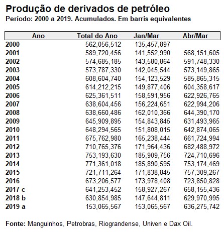 No acumulado dos últimos 12 meses, a produção nacional de derivados de petróleo, segundo informações da ANP, ficou em 636,2 milhões de barris equivalentes. Apesar da leve alta sobre 2018, permanece como o segundo menor nível de produção desde 2010.