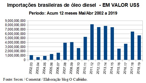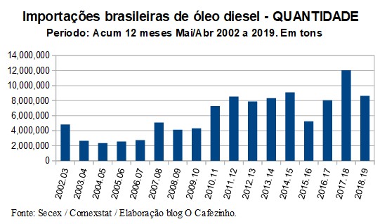 As importações de óleo diesel, por outro lado, o principal combustível usado no país, por ser aquele usado no transporte rodoviário de nossas mercadorias, cresceram fortemente no mesmo período em que nossas exportações começaram a ganhar volume.