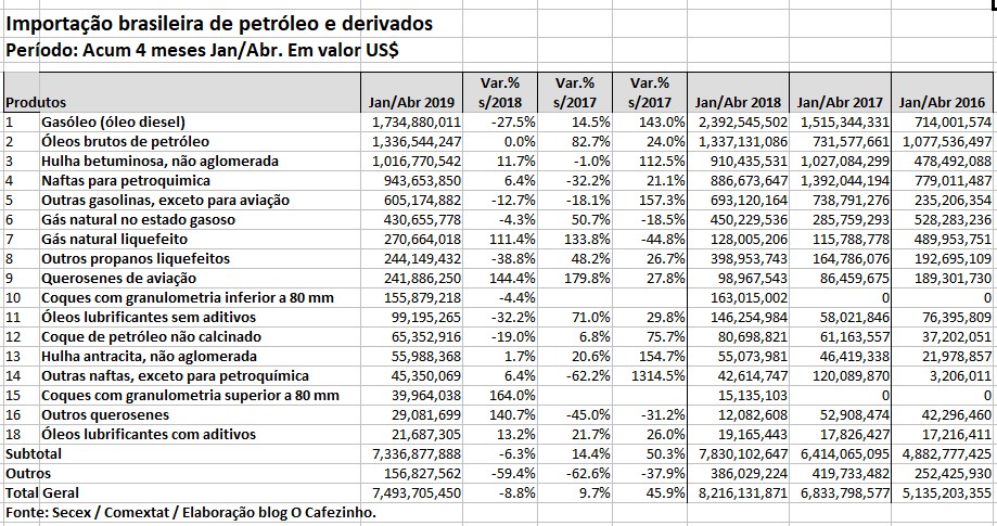 O Brasil importou US$ 605 milhões em gasolina em Jan/Abr 2019, queda de 12,7% sobre o ano anterior e de 18% sobre 2017, mas alta de 157% sobre igual período de 2016.
