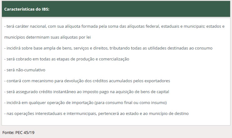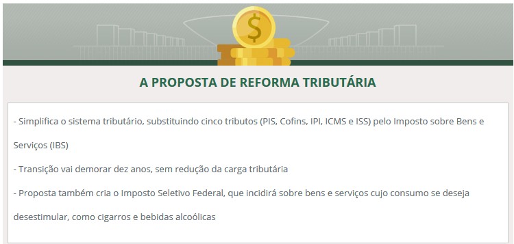 De autoria do deputado Baleia Rossi (MDB-SP), a proposta acaba com três tributos federais – IPI, PIS e Cofins. Extingue também o ICMS, que é estadual, e o ISS, municipal. Todos eles incidem sobre o consumo. No lugar, é criado o IBS – Imposto sobre Operações com Bens e Serviços, de competência de municípios, estados e União, além de um outro imposto, sobre bens e serviços específicos, esse de competência apenas federal. O tempo de transição previsto é de dez anos.