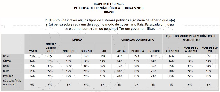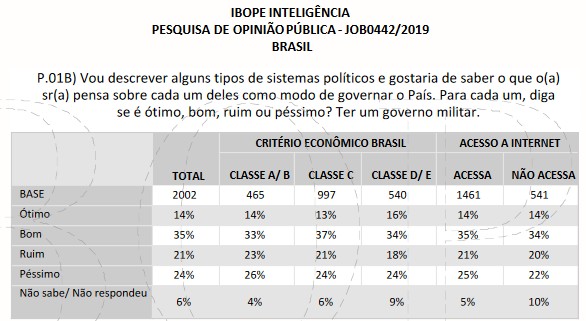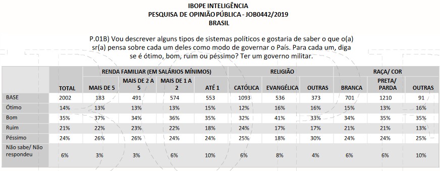 Metade dos brasileiros (49%) consideram ótimo ou bom ter um governo militar. É o que mostra uma pesquisa do IBOPE Inteligência realizada no mês de abril. Apesar de considerável, esse valor era maior em janeiro: 62% pensavam dessa maneira no início do governo de Jair Bolsonaro. Por outro lado, nesses quatro meses, o percentual dos que consideram ter um governo militar no Brasil ruim ou péssimo cresce de 32% para 45%.