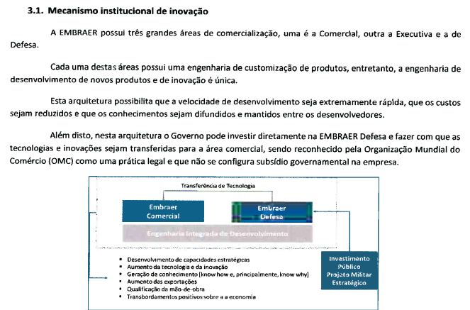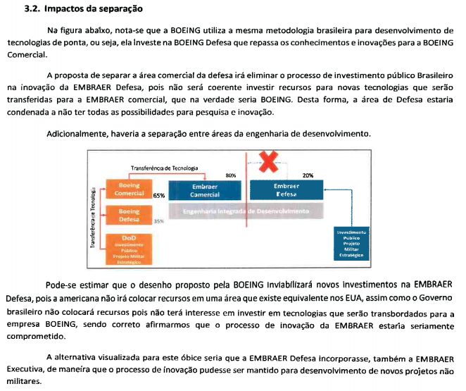 Na análise da Aeronáutica, a proposta de separar as duas áreas “irá eliminar o processo de investimento público brasileiro na inovação da Embraer Defesa, pois não será coerente investir recursos para novas tecnologias que serão transferidas para a Embraer Comercial”, que passará ao controle da Boeing.