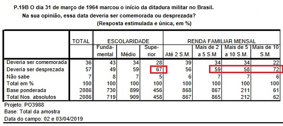 Uma pesquisa Datafolha feita em abril deste ano (e que eu já comentei em longo post) mostra que os eleitores de renda média e mais instruídos rejeitam, massivamente, a ditadura militar: entre eleitores com ensino superior, 67% acham que a ditadura deveria ser “desprezada”; entre eleitores com renda acima de 10 salários, 72% também são contra a ditadura.