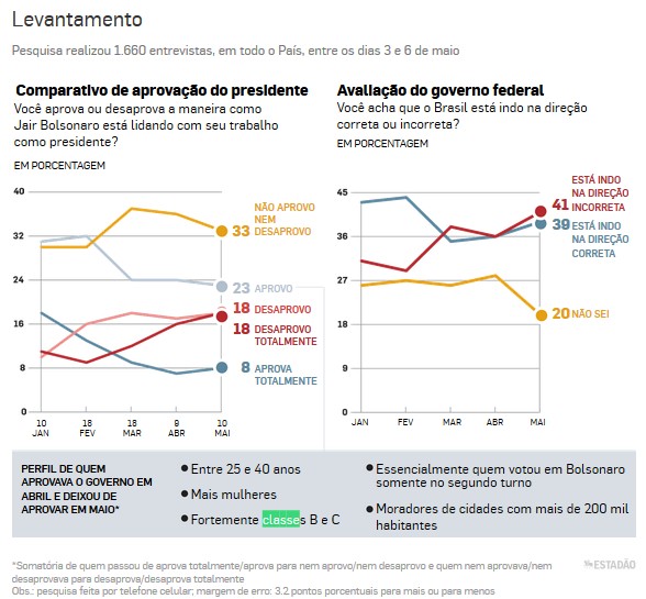No artigo de Ricardo Galhardo e Paulo Beraldo, para o Estadão, temos informações do instituto Big Data, de que “a maior parte dos eleitores que optaram por Bolsonaro e hoje rejeita o governo é formada por mulheres com idade entre 25 e 40 anos, integrantes das classes B e C, não evangélicas e que vivem em cidades com mais de 200 mil habitantes nas regiões Norte e Nordeste”.