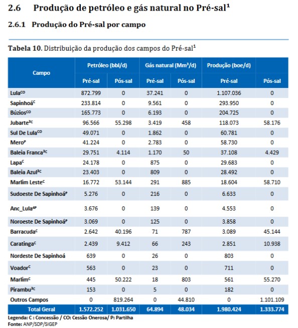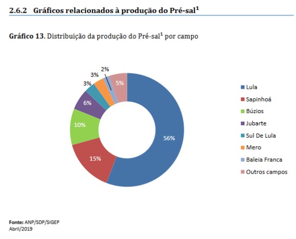 O campo de Lula, na Bacia de Santos, foi o que mais produziu petróleo e gás, com uma média de 873 mil de barris de petróleo por dia (bbl/d) e de 37,2 milhões de metros cúbicos de gás natural por dia (m³/dia).