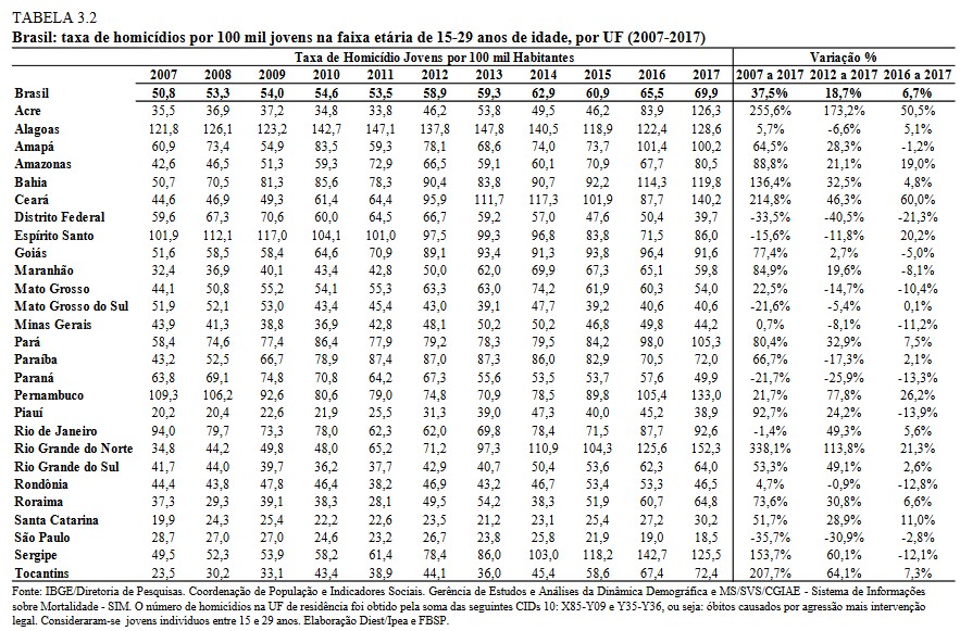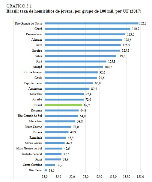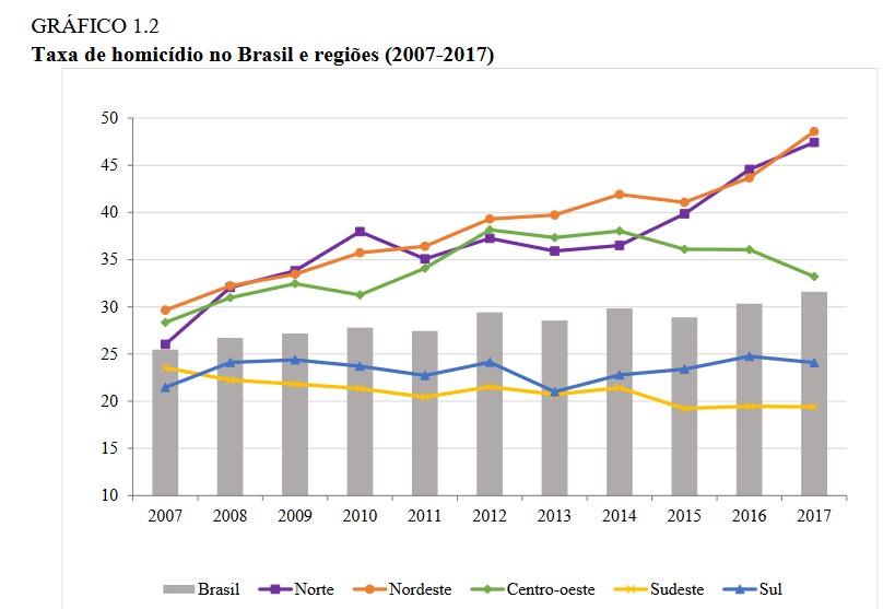 O estudo identifica dois fenômenos no país: enquanto mais estados reduzem a taxa de letalidade violenta, há forte crescimento no Norte e no Nordeste. Em 2017, as taxas de homicídios por 100 mil habitantes foram bastante heterogêneas entre as unidades da Federação, variando de 10,3 em São Paulo a 62,8 no Rio Grande do Norte. Houve diminuição no Sudeste e no Centro-Oeste, estabilidade no Sul e crescimento acentuado no Norte e no Nordeste.