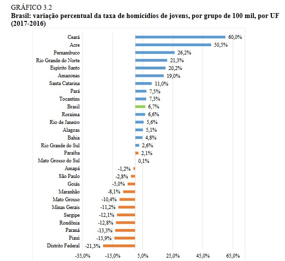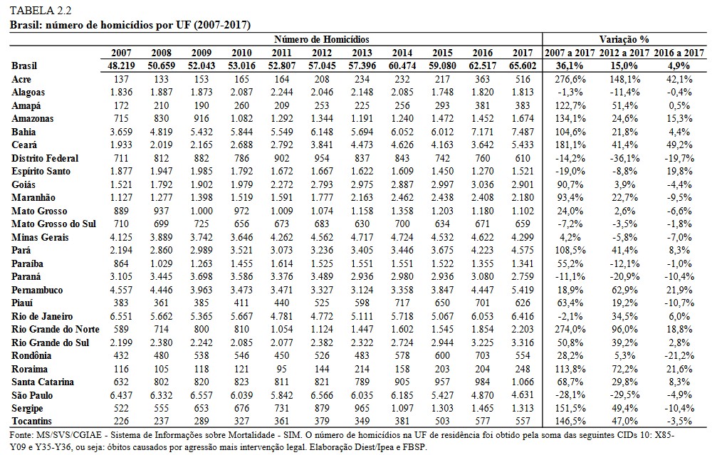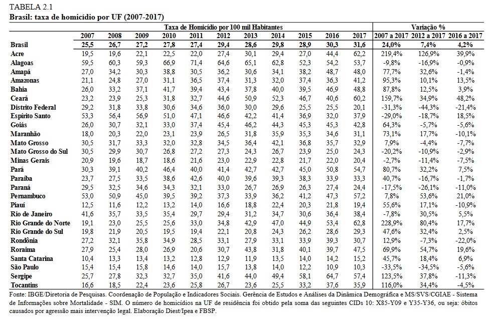 O estado com maior crescimento no número de homicídios em 2017 foi o Ceará, que registrou alta de 49,2% e atingiu o recorde histórico de 5.433 mortes violentas intencionais, causados por armas de fogo, droga ilícita e conflitos interpessoais. No Acre, a variação foi de 42,1% em 2017, totalizando 516 homicídios – considerando-se o período de 2007 a 2017, o número de homicídios subiu 276,6% no estado.