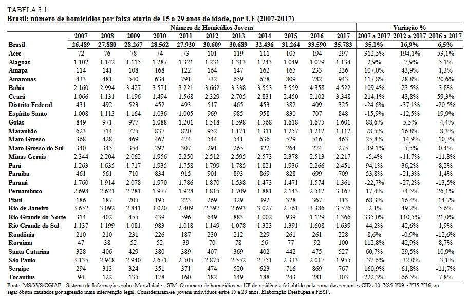 Apenas em 2017, 35.783 jovens de 15 a 29 anos foram mortos, uma taxa de 69,9 homicídios para cada 100 mil jovens, recorde nos últimos 10 anos. A juventude perdida é considerada um problema de primeira importância para o desenvolvimento social do país e vem aumentando numa velocidade maior nos estados do Norte. Os dados do Atlas da Violência também trazem evidências de outra tendência preocupante: o aumento, nos últimos anos, da violência letal contra públicos específicos, incluindo negros, população LGBTI+ e mulheres, nos casos de feminicídio.
