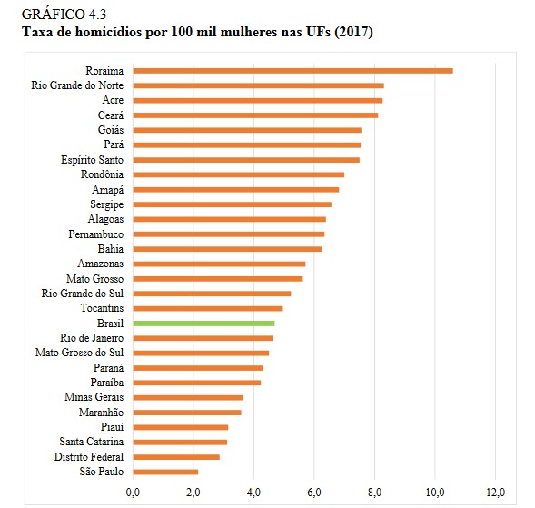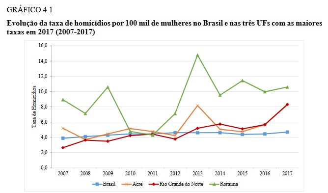 O ano de 2017 registrou, também, um crescimento dos homicídios femininos no Brasil, chegando a 13 por dia. Ao todo, 4.936 mulheres foram mortas, o maior número registrado desde 2007 – 66% delas eram negras. Entre 2007 e 2017, houve um crescimento de 30,7% nos homicídios de mulheres no Brasil. A situação foi mais grave novamente no Rio Grande do Norte, que apresentou uma variação de 214,4% em 10 anos, seguido pelo Ceará (176,9%). As maiores reduções decenais ocorreram no Distrito Federal, no Espírito Santo e em São Paulo, entre 33,1% e 22,5%. Chama a atenção o caso do Espírito Santo, que era campeão da taxa de homicídios femininos no país em 2012.